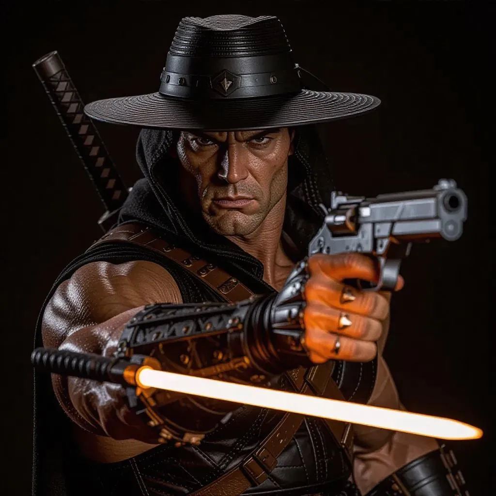 A heroic figure in Hery style, muscular with powerful hands gripping a futuristic laser gun and a sleek machine ninja blade. Dark clothes and a black, funky hat adorn his body, reminiscent of a modern-day hero. His face is chiseled with intense, movie-worthy details, evoking the spirit of He-Man.