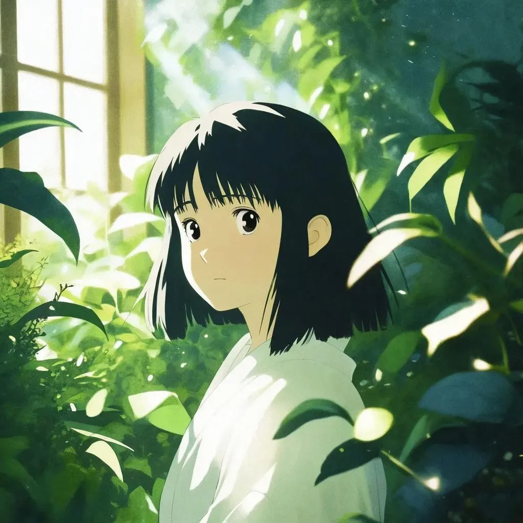 Generate Studio Ghibli-inspired anime art with vivago.ai. Create serene anime girl portraits in white, surrounded by lush plants under sunny skies. Featuring Spirited Away-style flat illustrations, dreamy soft-focus colors, and premium quality for stunning Japan animation wallpapers. AI-powered creativity for professional-grade, whimsical visuals.