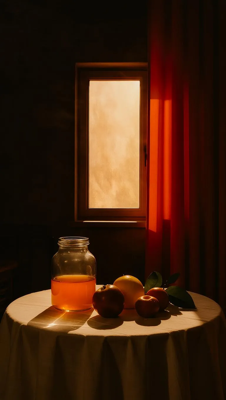 Create cinematic still life AI images - a jar & fruit on table with warm lighting & bold red-orange curtains against dark walls. Generate moody, painterly compositions evoking timeless simplicity. Use Vivago.ai AI generator to transform text prompts into professional visuals.