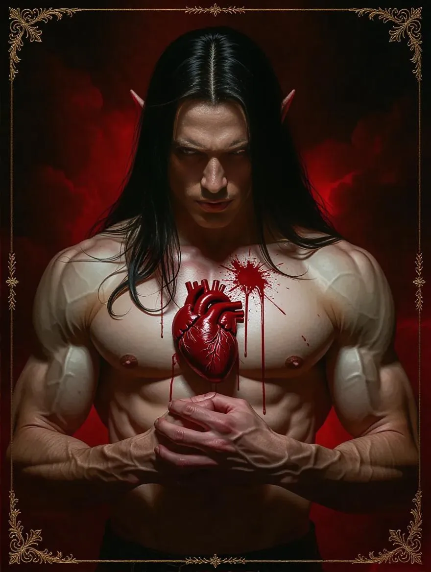 Create a dark fantasy portrait with AI: a pale, muscular man with glowing red eyes and long black hair, melancholic expression, anatomical heart bursting from his chest. Dramatic rim lighting, ominous clouds, painted texture, brushstrokes, golden border. High-detail 8K UHD horror art, blending realism and macabre fantasy.