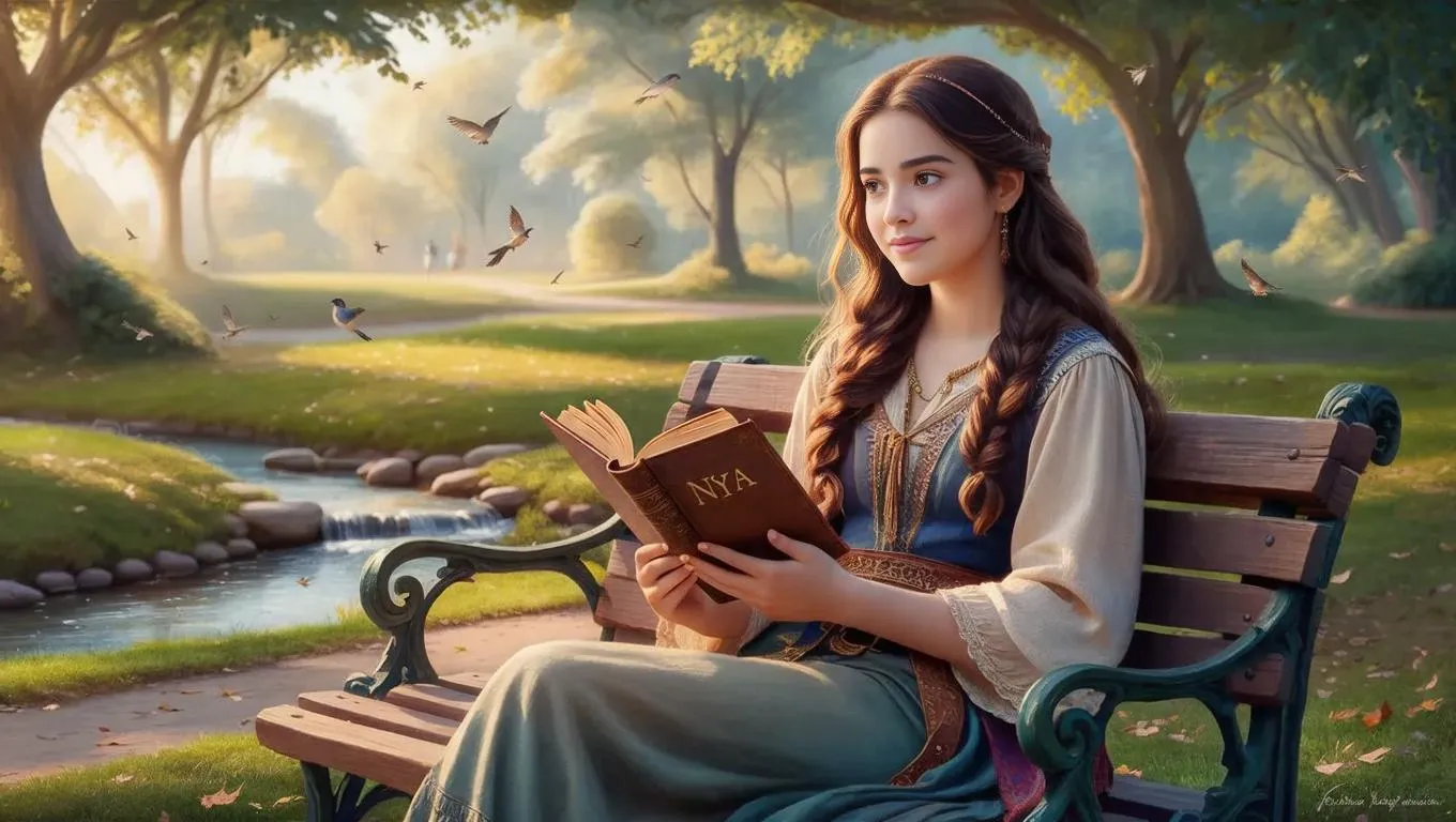 Craft a tranquil AI-generated scene of a serene park with lush greenery and gentle breezes. Visualize Niya, a young woman immersed in her book on a wooden bench. Perfect for creating peaceful nature imagery with vivid details and immersive atmosphere. Transform your ideas into stunning visuals with VivaGo.ai's AI image generator.