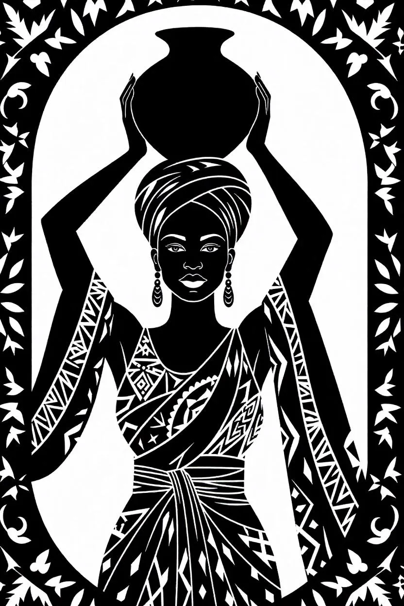 Striking black-and-white silhouette of a serene African woman in traditional draped attire, balancing a water jar on her head. Symbolic, symmetrical composition highlights her curvaceous silhouette, dark complexion, and cultural elements like earrings. High-contrast minimalist style evokes African heritage with a strong, serene aesthetic against a clean white background.