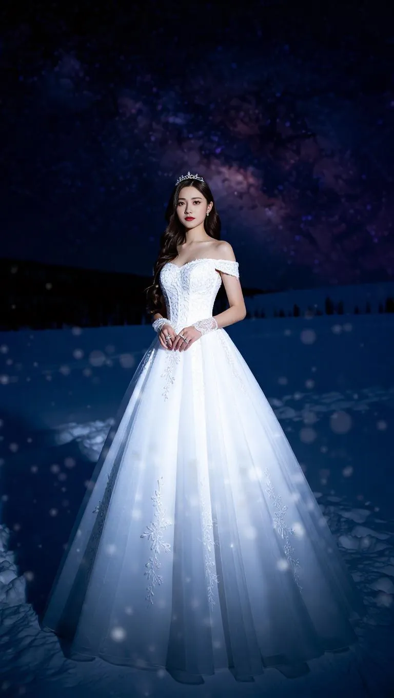 Create a celestial winter portrait with Vivago.ai: Generate a serene snowy landscape featuring an elegant woman in a glittering floral-adorned gown and tiara, set under a starry night sky. Transform text into ethereal AI visuals blending intricate details with frosty, celestial beauty for professional imagery.