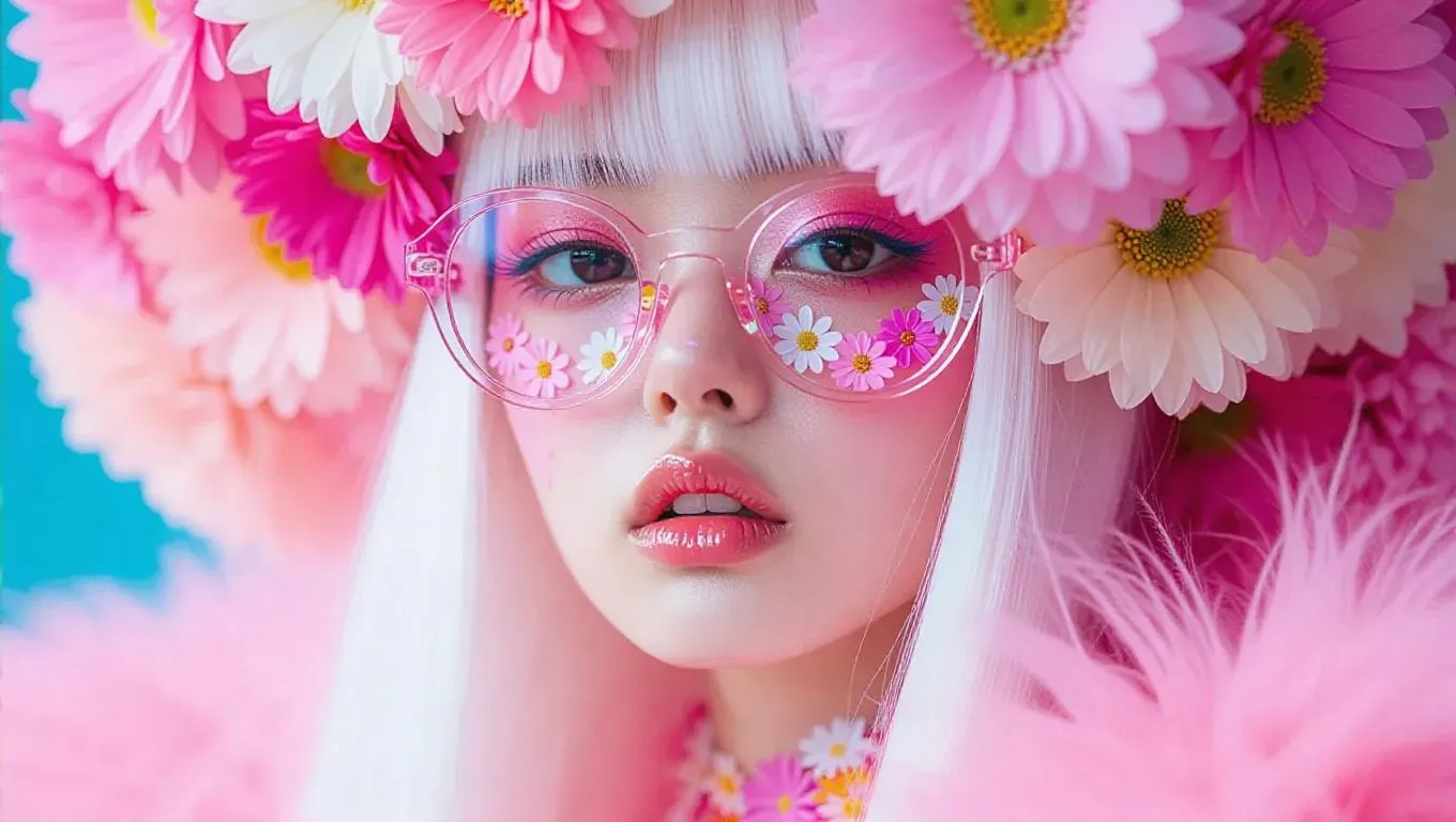 Generate surreal Y2K fashion photography with this AI-powered prompt: a Japanese flower queen adorned in pastel blooms, neon floral makeup, and a pink fluffy dress covered in miniature flowers. Blends kawaii aesthetics, avant-garde surrealism, and vivid AI art for striking, dreamlike visuals inspired by futuristic anime and vibrant Harajuku culture.