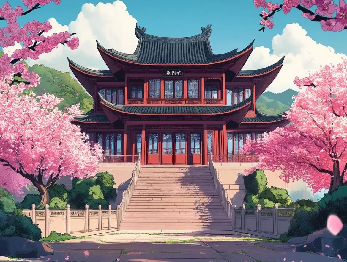 Transform text into AI-generated realistic comic book art of ancient Chinese mansions with cherry blossom backgrounds. Create vibrant, professional visuals blending traditional architecture and anime-inspired styles using Vivago.ai's AI tools for stunning, dynamic imagery.