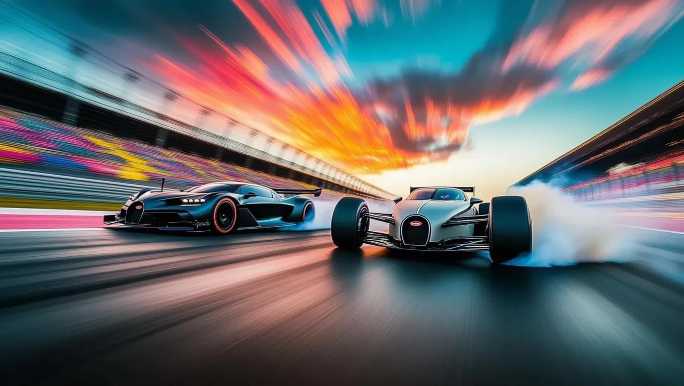 Experience high-speed thrills with AI-generated visuals of an F1 car racing a Bugatti at 300 MPH. Dynamic low-angle shots, intense motion effects, and lifelike details capture the adrenaline of this elite motorsport showdown. Elevate your content with professional-grade racing imagery powered by advanced AI creativity.