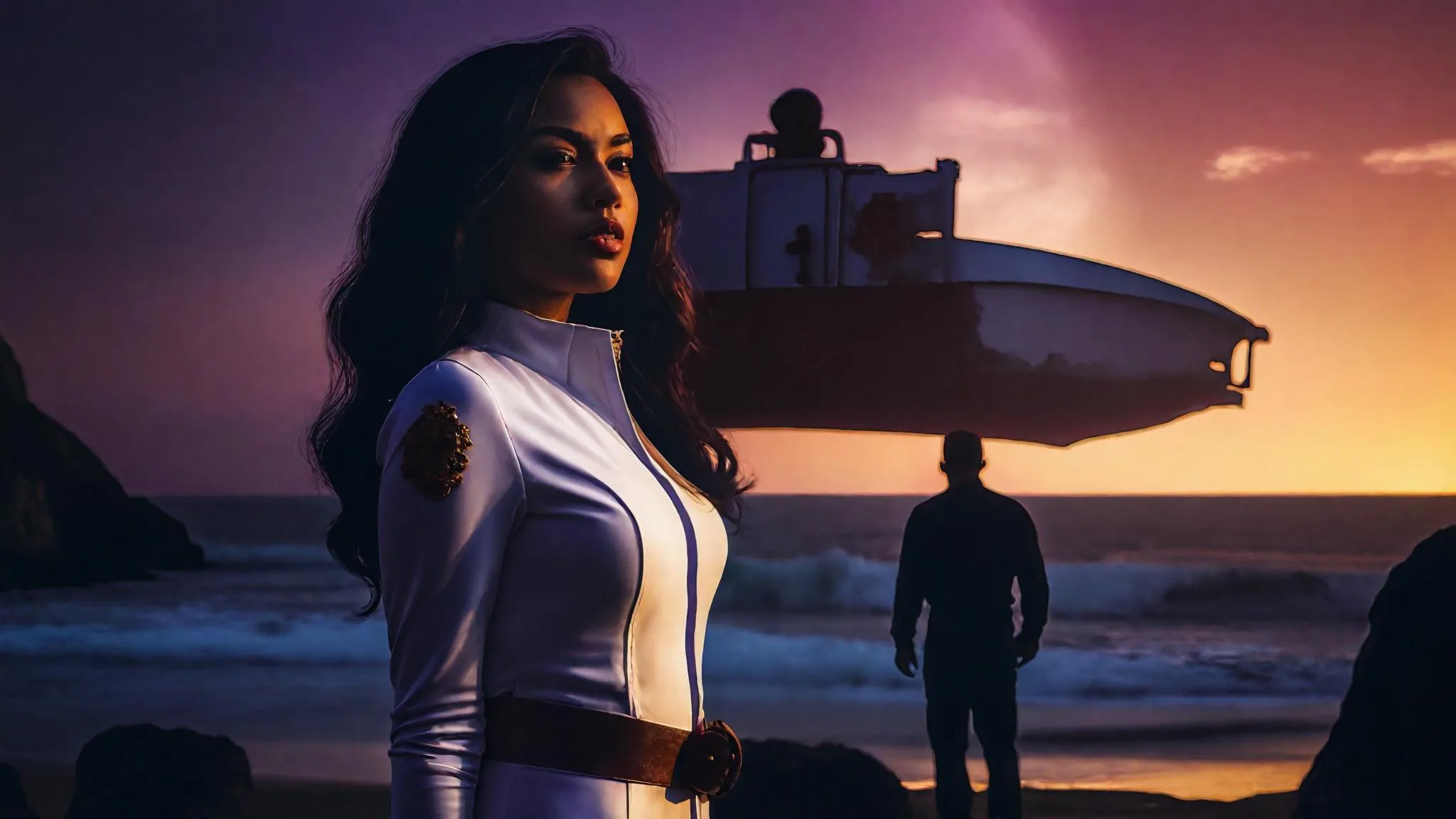 Capture a serene Pacific Ocean sunset with AI-generated cinematic visuals. Silhouettes of a couple, vibrant mauve-lavender skies, and golden waves glow. Shallow depth of field highlights romantic, contemplative moods. Perfect for professional-grade imagery—transform text into breathtaking scenes with VivaGo.ai's AI tools.
