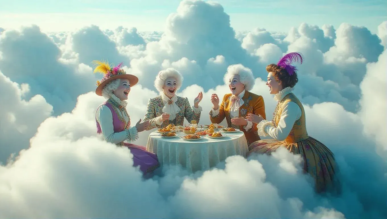 A vibrant, cloud-dwelling picnic scene, set amidst wispy, white cumulus masses, featuring eccentric, fantastical characters in whimsical attire, laughing, gesturing, and savoring ethereal delicacies. Delicate, gossamer strands of cloudstuff waft around them, and iridescent, feathery contrails streak the cerulean sky, creating a dizzying, dreamlike, hyper-realistic, surrealist landscape. Shot from a hovering, bird's-eye vantage point, bathed in soft, creamy, diffused light.