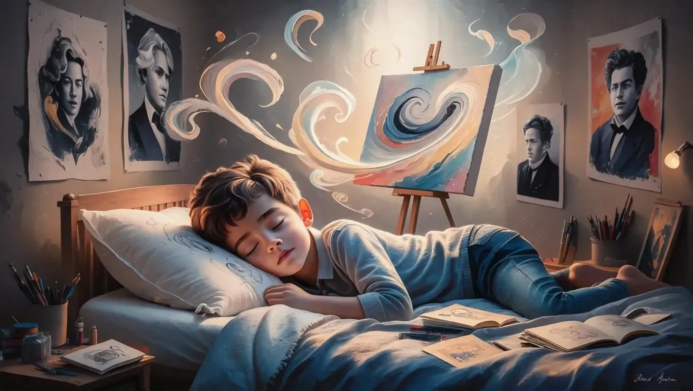 Visualize a young artist's dreams with AI-generated artwork, capturing a boy lying on a bed, envisioning his future as a renowned creator. Transform text prompts into stunning visuals using Vivago.ai's advanced AI tools for professional-grade, imaginative results.