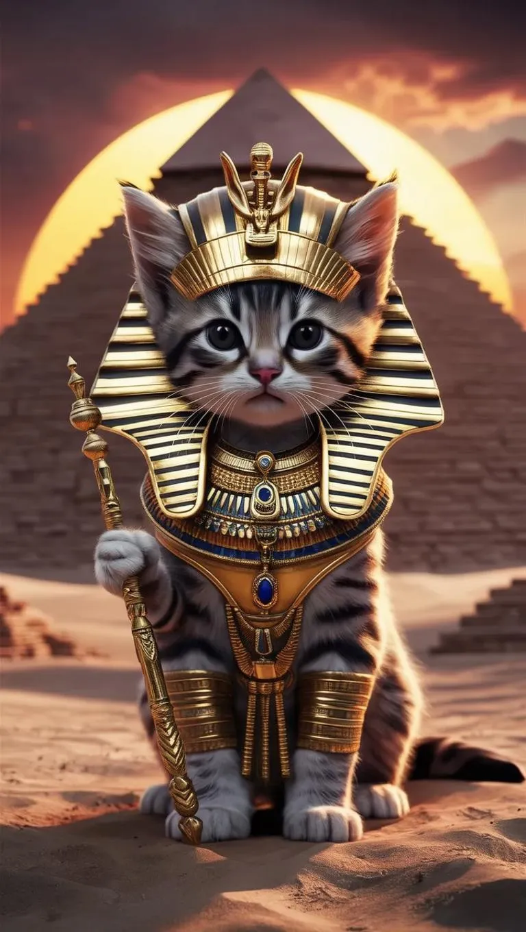 Create a mythical Egyptian Pharaoh kitten in ultra-high 16K resolution. This regal feline wears a shimmering gold pharaoh’s headdress, intricate jewelry, and holds a mystical scepter, standing before pyramids under a blazing desert sunset. Ray Tracing enhances hyperrealism for royal, historical AI-generated art with ultra-detailed textures and lifelike lighting.