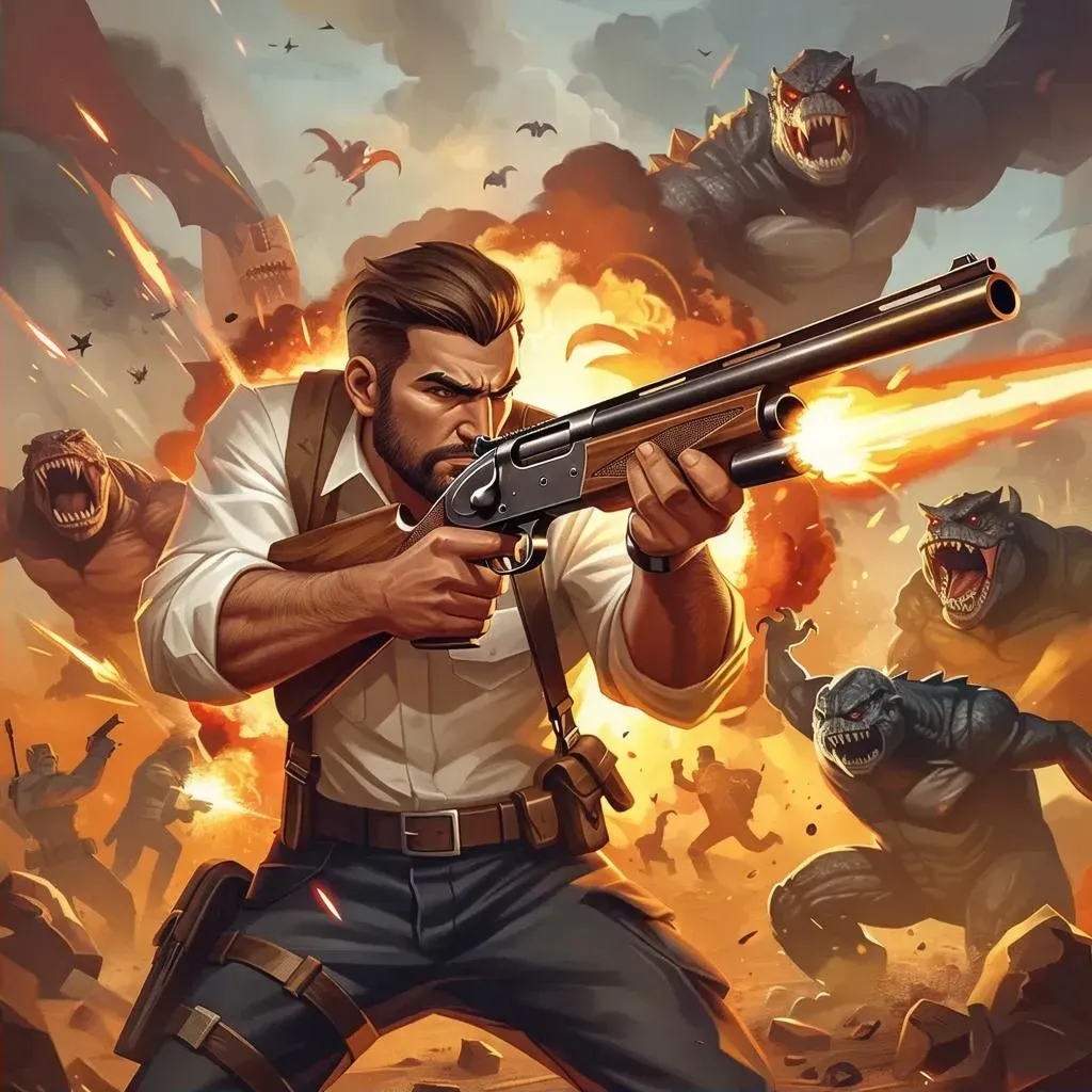 make a game icon of a shooting game with a man holding a double barrel shotgun in his hands with explosion in background and some monsters far away chasing him. make sure to add more things to attract players to it.