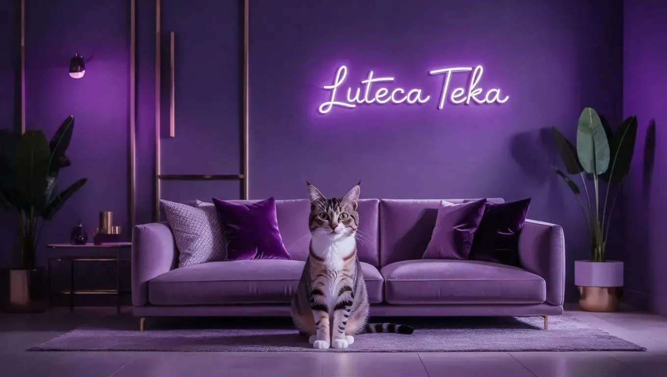 Transform your space with AI-powered design: a luxury living room blending modern elegance and a sleek feline companion. Accentuated by a vibrant purple neon sign reading "Luteca Teka," this scene merges contemporary luxury with personalized ambiance. Explore AI-generated interiors for sophisticated, photorealistic visuals tailored to elevate your creative projects.