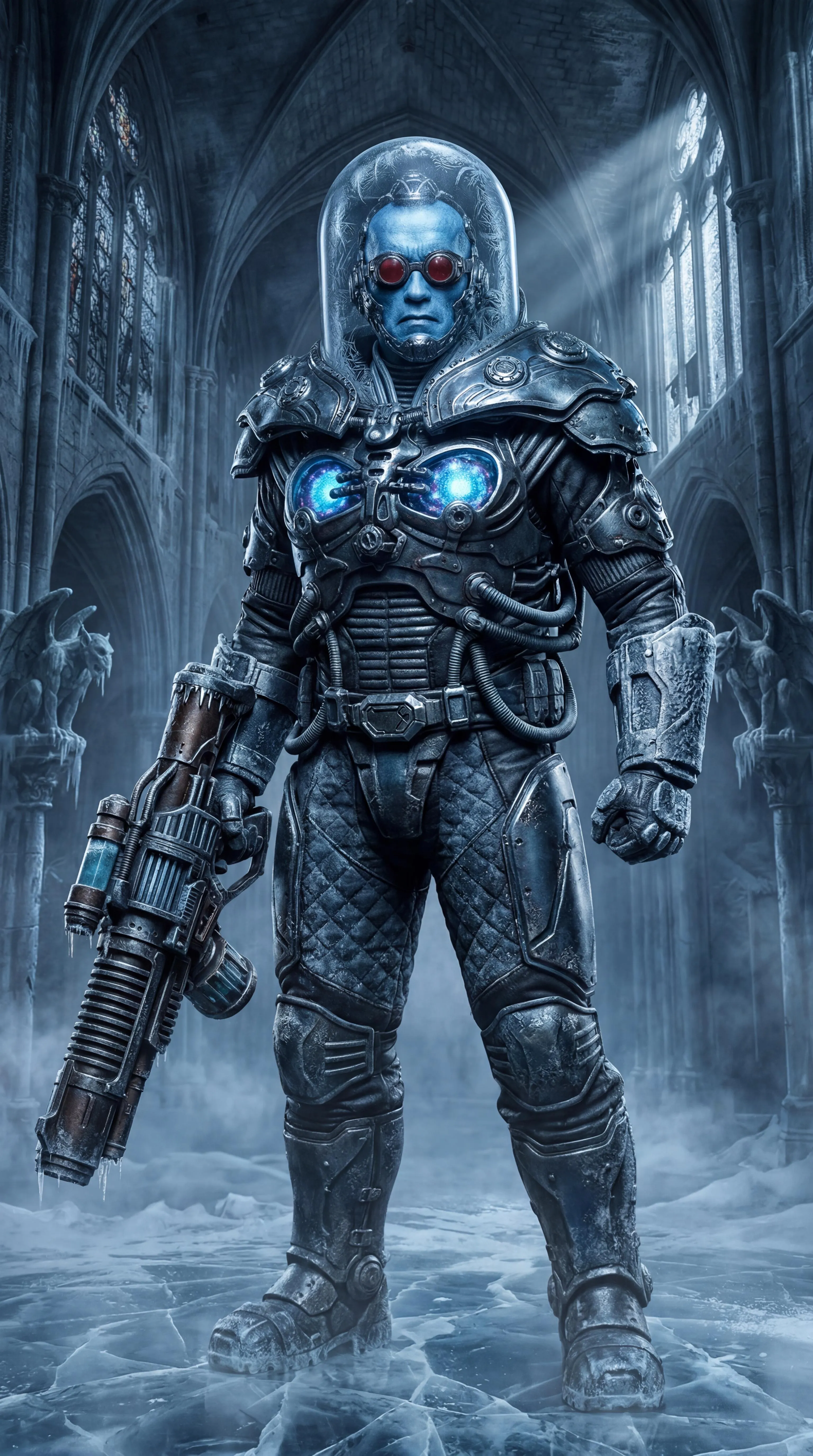 The art style from how Mister Freeze appears in the comics are translated into the realistic aesthetic of Arnold Schwarzenegger's live-action portrayal of Bane (from Batman & Robin), albeit to fit Tim Burton's much darker and more gothic tone for the Batman films instead of Joel Schumacher's much flashier and more flamboyant direction. Batman is not charging at him, nor are there any artist signatures. No sensitive information or guidelines violating content seen or involved.