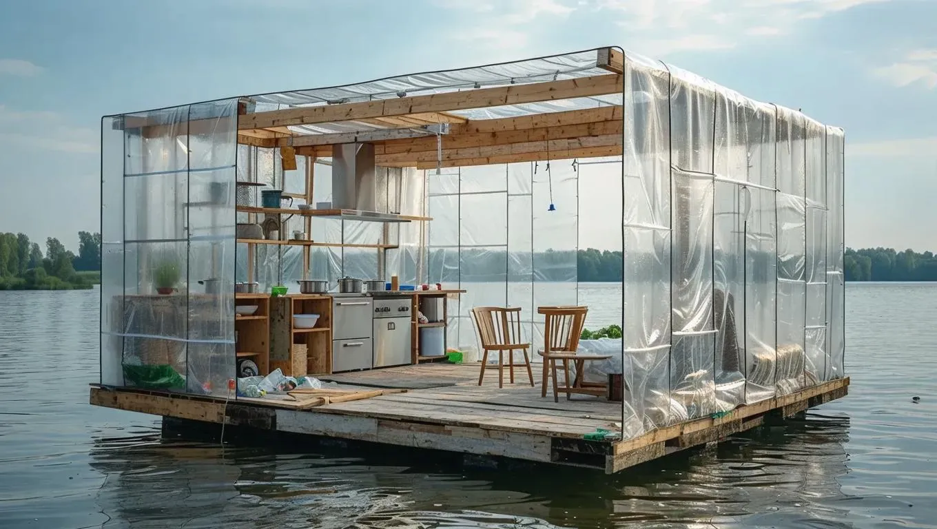 Generate AI visuals of rugged water transport scaffolding with transparent plastic walls and wooden frames, showcasing a degraded outdoor kitchen built from recycled construction waste. Features weathered kitchen elements, distressed armchairs, and a rustic coffee table for gritty, low-budget industrial ambiance.