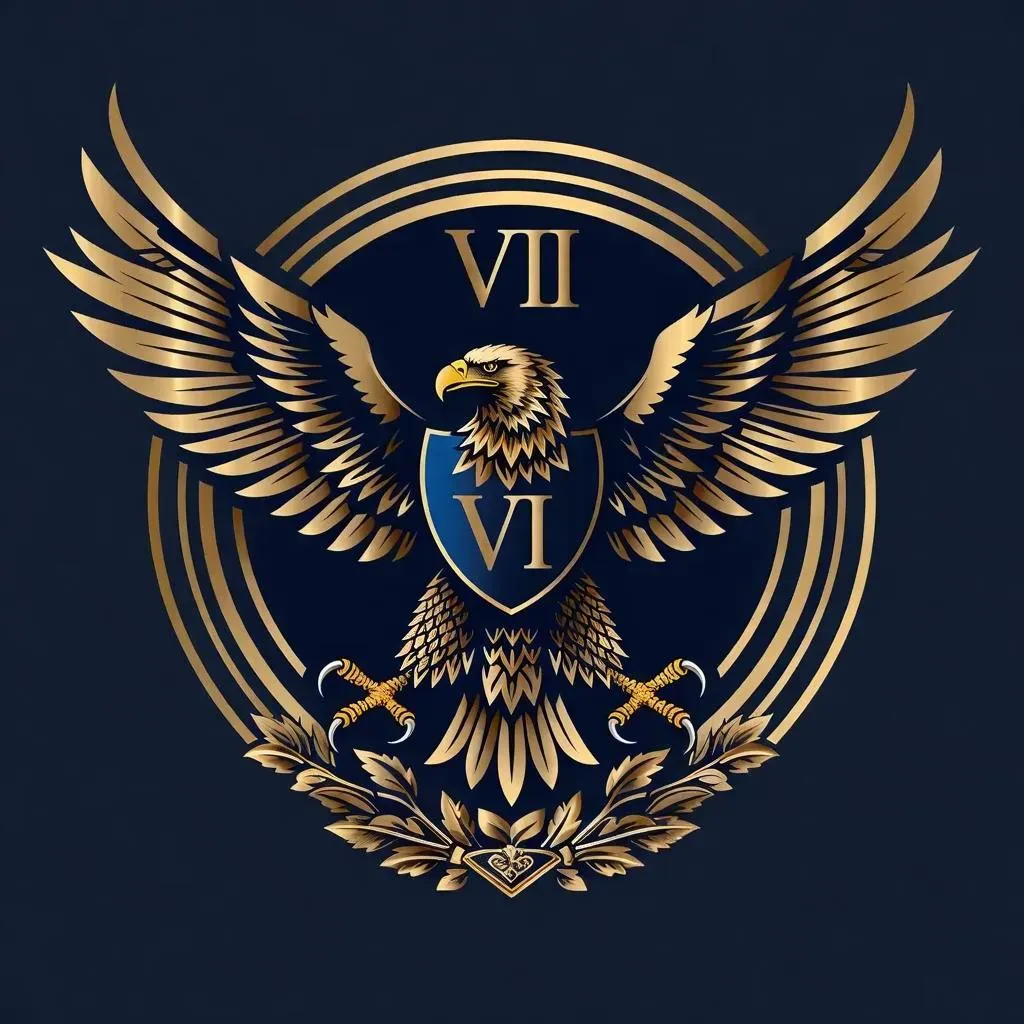 Create a sleek, minimalist eagle logo inspired by Saint Cyr Military School's emblem, stylized with symmetrical wings mid-hunt. Features a simplified eagle clutching Roman numeral VII in its talons, designed as a clean vector graphic with no background. Perfect for sweater logos—bold yet understated, blending heraldic symbolism with modern simplicity.