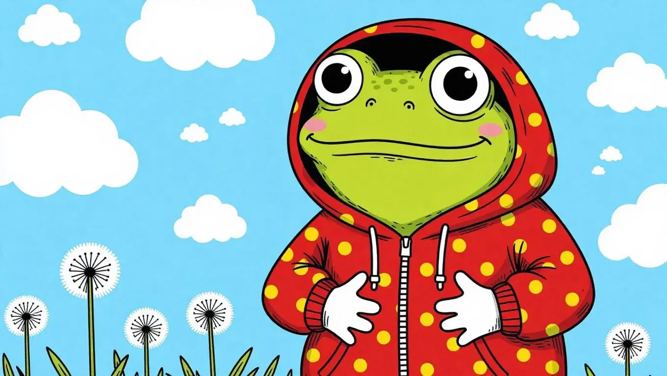 Generate a whimsical AI children's drawing featuring a big-headed frog in a red hoodie with yellow polka dots, crayon-textured lime skin, and starry eyes. Playful naive art style with pencil lines, cartoon clouds, and dandelion puffs against a sky-blue backdrop. Perfect for vibrant kids' illustrations, cartoon character design, or cheerful nursery decor.