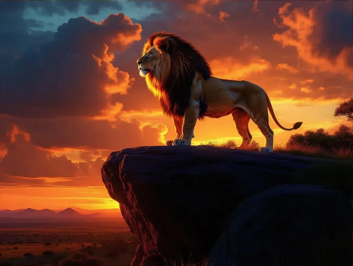 Create a hyperrealistic digital painting of a majestic lion with a fiery mane atop a sunset-lit cliff. Featuring 8K resolution, dramatic lighting, and intricate savannah details, inspired by National Geographic's realism and fantasy art. Ideal for AI-generated visuals trending on ArtStation, blending natural grandeur with mythical power.