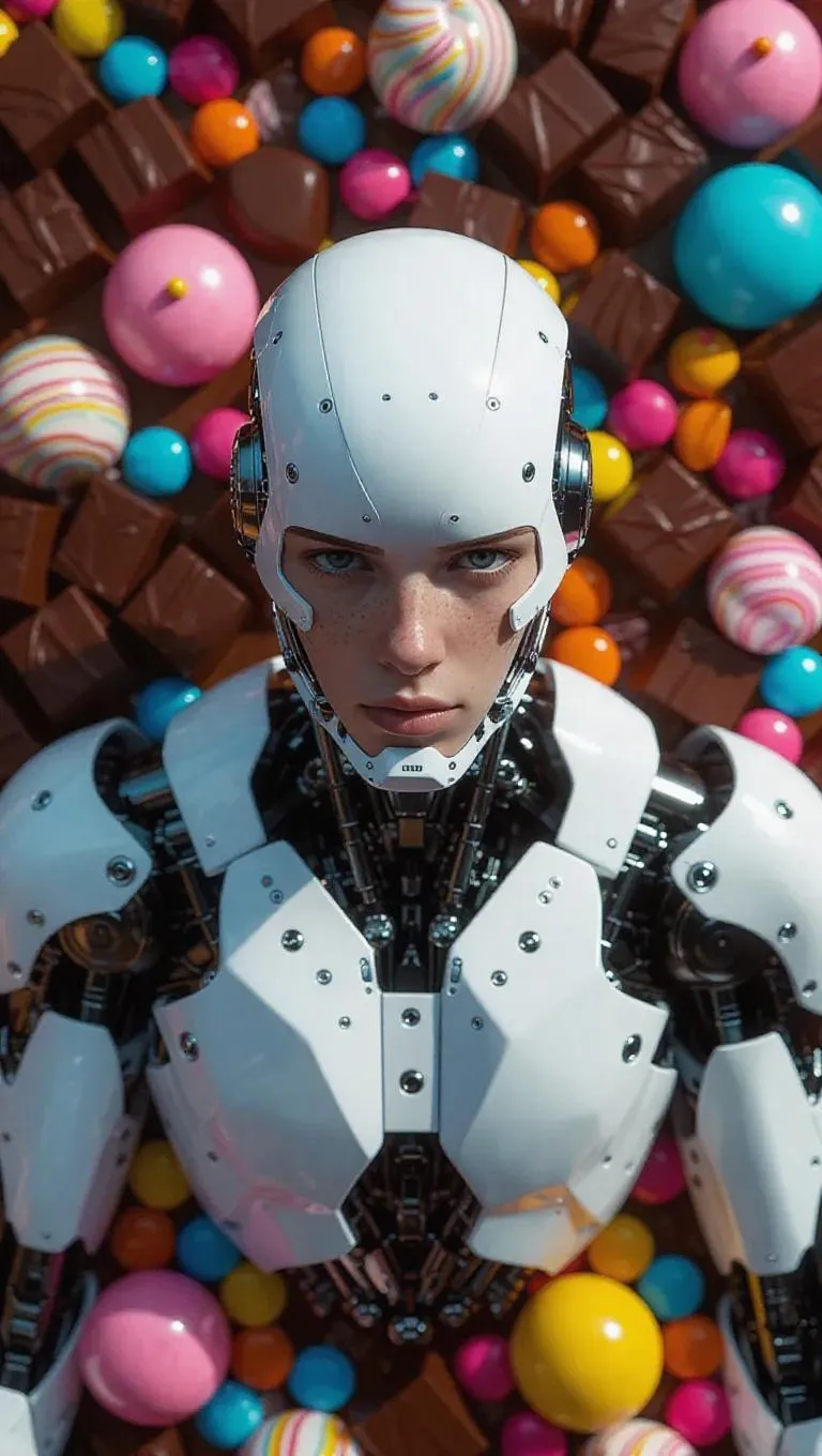 A superior human with advanced nanotechnology, surrounded by subtle Easter eggs in nature, colorful chocolates, and candies scattered around, viewed from an overhead camera angle, capturing the intricate details and futuristic flair.