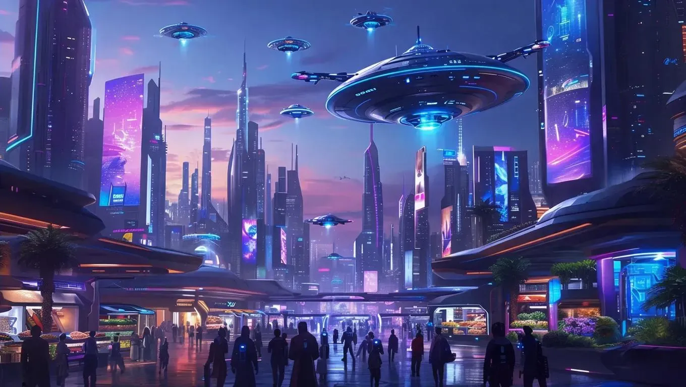 Explore a vibrant cyberpunk metropolis with neon-lit skyscrapers, holographic displays, and hovering vehicles. This high-contrast, dynamic aerial view showcases a bustling urban environment with bioluminescent vertical gardens, glowing streets, and advanced tech. Dive into a sci-fi world blending organic and synthetic elements for an immersive, futuristic experience. Create your own cyberpunk scene at vivago.ai.