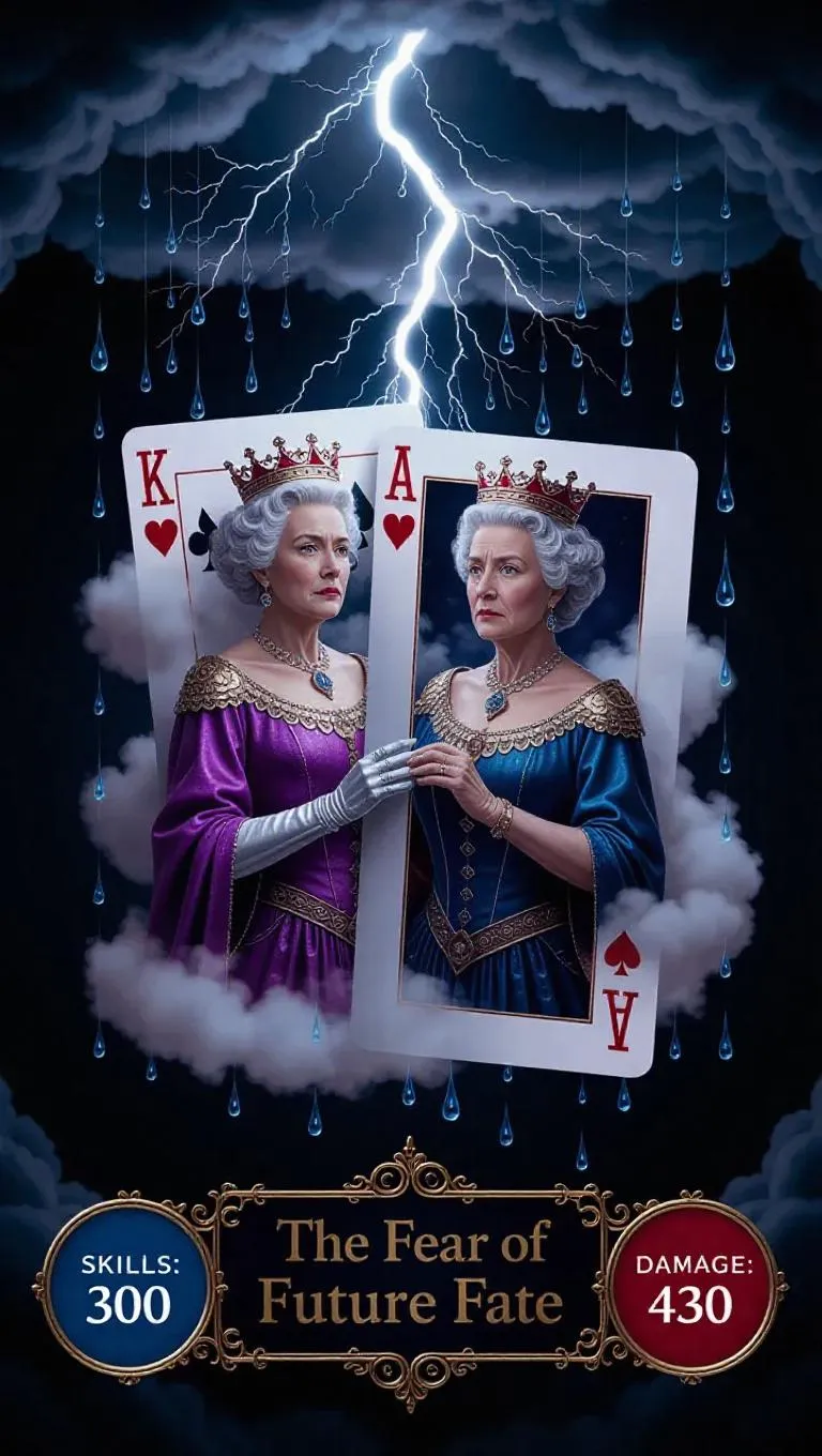 A majestic fantasy electric lightning storm conjures old and young versions of the same queen, both adorned on a queen card, surrounded by ethereal clouds and shimmering tears transforming into raindrops, 3D dimensional game playing card, intricate details, glowing aura, royal regalia, mystical realm backdrop, heavens, card labeled "The Fear of Future Fate" inside a themed box with elegant fantasy text at the bottom middle, reading "fear of future fate". Bottom left circle with "skills: 300". Bottom right circle with "damage: 430".