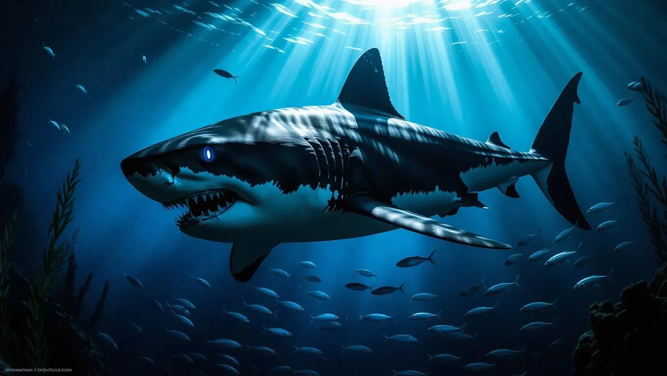 Generate a menacing black shark with sleek obsidian scales and glowing bioluminescent eyes in the abyssal ocean. AI-powered hyper-detailed textures, cinematic chiaroscuro lighting, and haunting crimson clouds contrast dark waters. Vivago.ai crafts professional visuals with eerie coral, scattered fish, and ancient shipwrecks for dramatic underwater imagery.