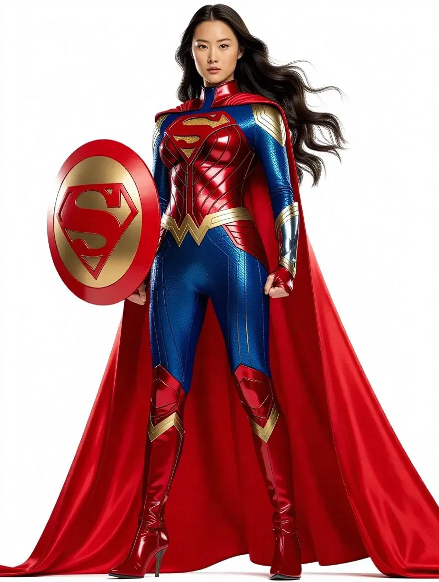 Experience a dynamic 4K HDR portrayal of China's superheroine CN GIRL: red-blue Kryptex bodysuit, diamond chest shield, crimson leather cape, and thigh-high boots. Full-body shots showcase her heroic dam-rescuing stance—legs slightly apart, confident posture—in 60fps clarity. Ultra-detailed textures capture flowing black hair, sleek costume design, and dramatic action realism.