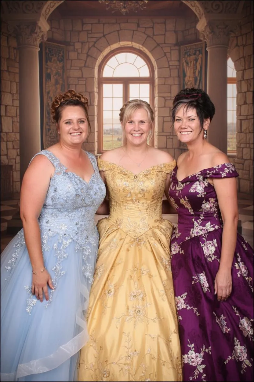 Change all 3 people in princesses in beautiful ball dresses in this photo. Do not change their faces. Change their hair in a formal pretty look. Each dress must look different with each person a diffrent color dress. Change the background to a castle. Do not change the faces in the photo. Keep the exact face in photo