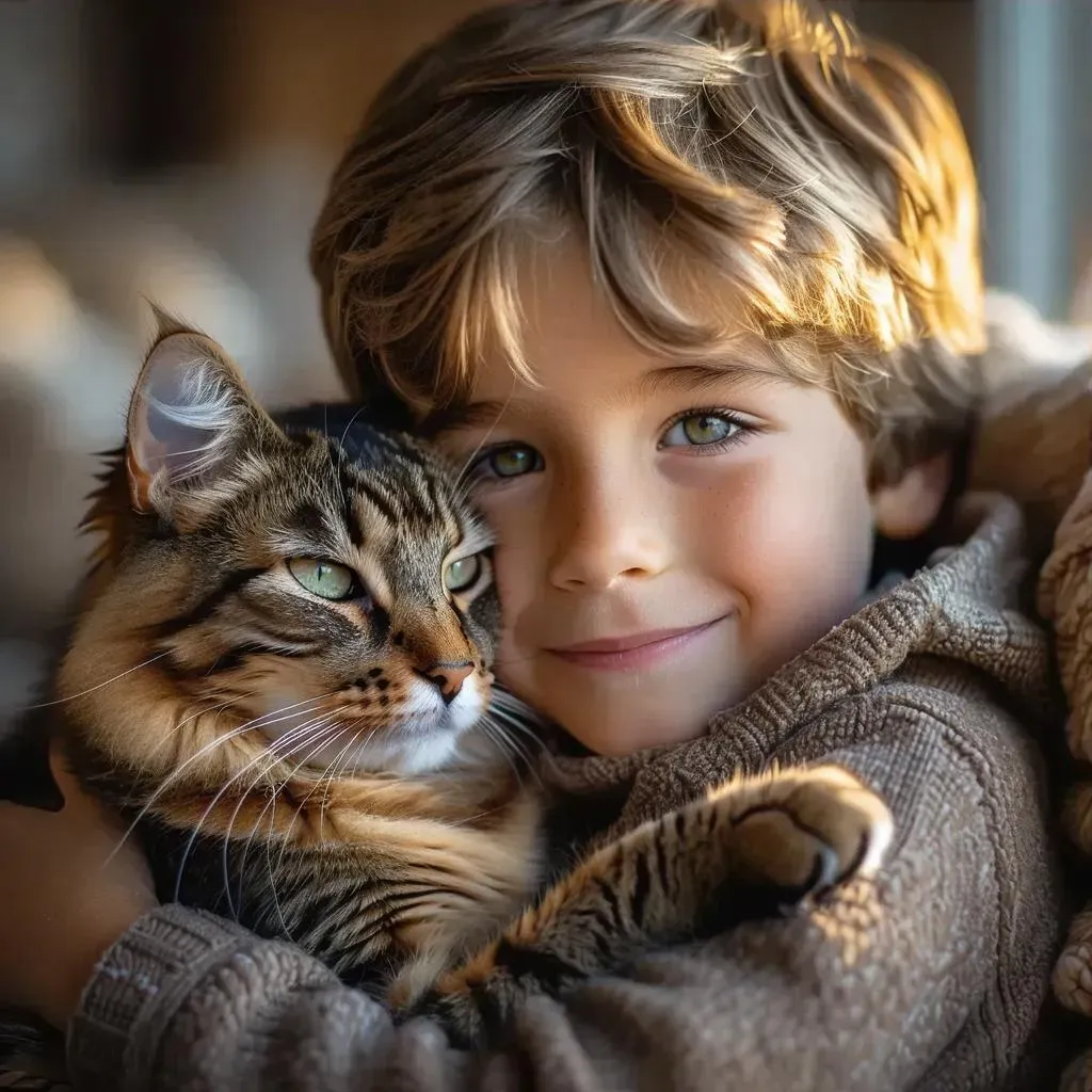 Generate hyperrealistic AI visuals of an Egyptian boy with his cat in cinematic indoor lighting. Explore professional-grade AI effects for lifelike details, dramatic shadows, and authentic textures, perfect for storytelling or artistic projects. Transform text prompts into vivid, emotionally resonant imagery with VivaGo.ai's advanced AI tools.
