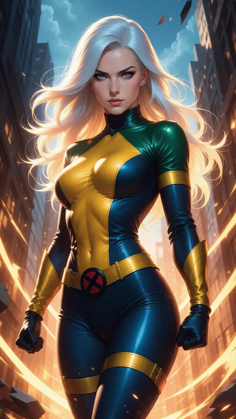 A stunning game card featuring the beautiful and powerful Rogue from Marvel X-Men, with her iconic white streaked hair and green eyes, standing confidently in her classic blue and yellow costume, set against a backdrop of swirling energy and cityscape, emphasizing her fierce and enigmatic presence.