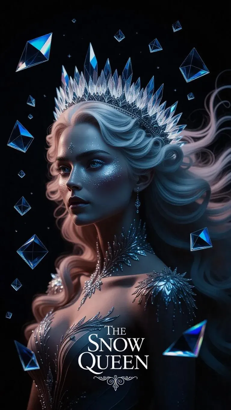 Discover "The Snow Queen" AI-generated portrait: celestial crystal crown, swirling nebula patterns, and prismatic light effects merge with iridescent highlights, flowing white hair, and ethereal translucence. Vivago.ai crafts this enchanting blend of cosmic fantasy and reality, featuring geometric shapes, glowing skin, and shattered mirror fragments. Elevate your visuals with AI-powered artistry, transforming text into mesmerizing, otherworldly imagery.