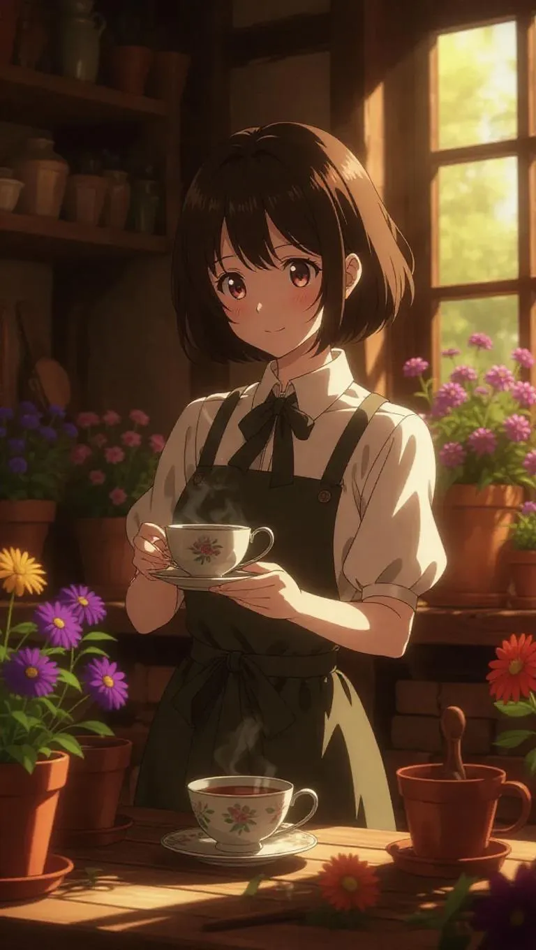 An anime gardener in a rustic dress tends to a bouquet of flowers beside a crackling fireplace, indulging in a cup of fragrant tea. Her expression is content and peaceful, eyes reflecting nature's beauty. The earthy flower workshop is filled with potted plants and gardening tools, warmed by the golden light of the fire that adds a cozy touch.