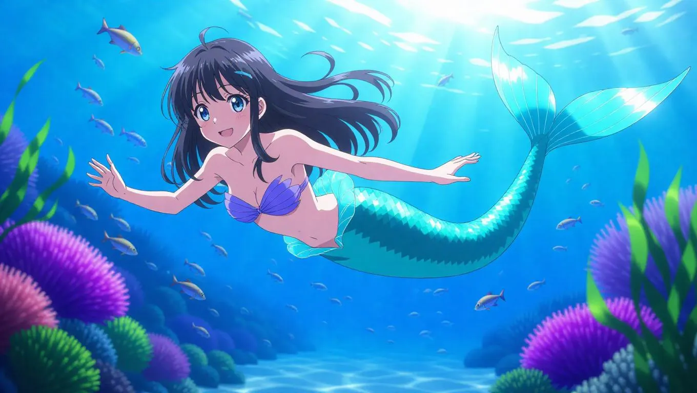 An anime mermaid princess curiously explores a coral reef, her tail glinting against the blue water. She wears a simple wrap made of seaweed. Her eyes are wide with wonder, and her pose is adventurous. The scene is under a clear day, with fish darting around her. Sunlight filters through the water, creating patterns of light around her. The style is vibrant and lively, emphasizing motion and wonder.