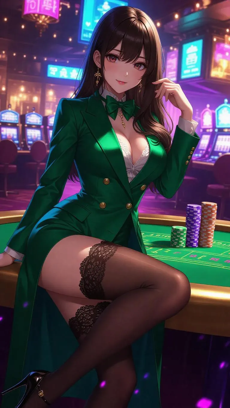 A charming anime gambler in a forest green silk tuxedo coat, lace stockings, and stylish pumps leans sideways on a gold-flecked casino table. She holds a stack of chips in one hand, her expression sly and inviting. Neon lights flicker in the background, highlighted by vibrant, colorful ambient lighting. The scene radiates thrill and energy, with a dash of seductive playfulness. Style: Anime, with a realistic touch.