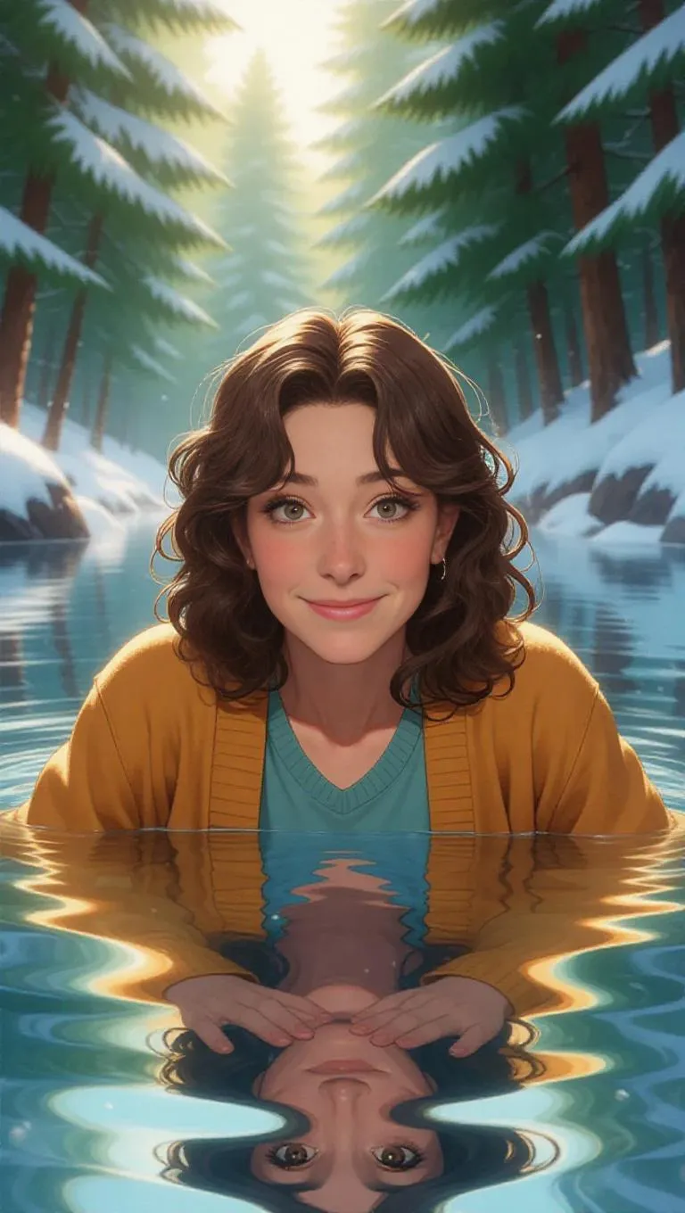 A middle-aged woman in a cozy cardigan slowly lowers herself into an icy river, surrounded by pine trees. Her curly, tied-back hair reveals her wise smile, portraying the serenity of the moment. Chilly waters swirl around her, mingling with the crisp air. Gentle reflections flutter on the water's edge, enhancing the tranquil and calming atmosphere. The scene is painted in cool, soft shades, creating a peaceful and serene ambiance. Style: Anime.