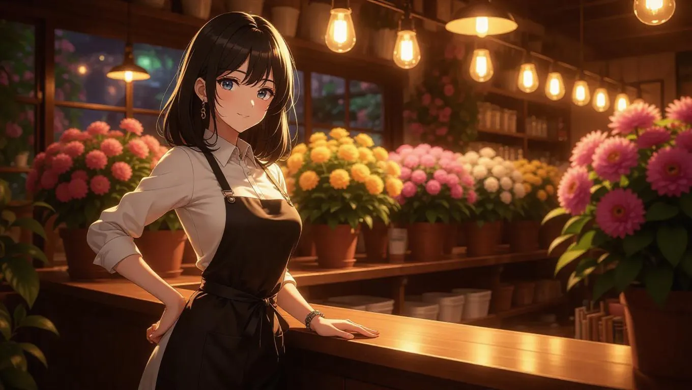 A stylish anime florist leans against a polished counter, her fitted apron and stylish heels accentuating her figure. Her eyes glint flirtatiously under the warm, ambient garden lights, which cast a soft glow over her. Rows of blooming flowers line the background, adding a vibrant touch to the scene. The lighting is warm and inviting, creating a cozy and intimate atmosphere. Style: Anime.