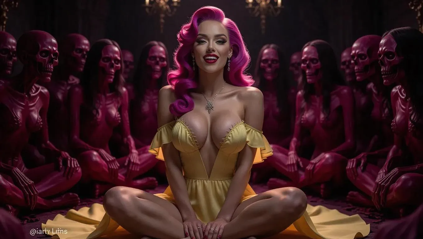 A dark queen with vibrant pink hair sits cross-legged, her captivating body clad in a dandelion yellow dress, the front slightly open. She smirks, licking her lips with spirited energy, her beautiful eyes and long eyelashes adding to her charm. Surrounded by undead inhabitants of the lost empire, she exudes a seductive and powerful presence. The dim room is lit with dramatic, glamorous light, casting deep shadows and highlights on her big breasts and face. The scene is a dark fantasy, realistic and photogenic, with a shallow depth of field and ultra-high-definition detail, capturing her in a close-up, raw photo of the best quality, a masterpiece of aesthetics.
