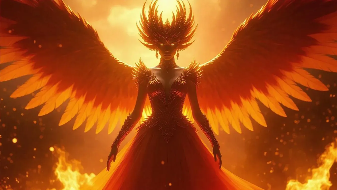 A mythical phoenix queen in a bright orange gown, embroidered with radiant feathers, stands proudly on a fiery perch. Her feathered hair flares like flames, and her golden eyes blaze fiercely. She is set against a backdrop of a burning sky, with flames dancing in all directions, creating a dramatic and awe-inspiring atmosphere. The scene is lit by intense, warm firelight, enhancing the fierce and majestic mood. Style: Realistic fantasy.