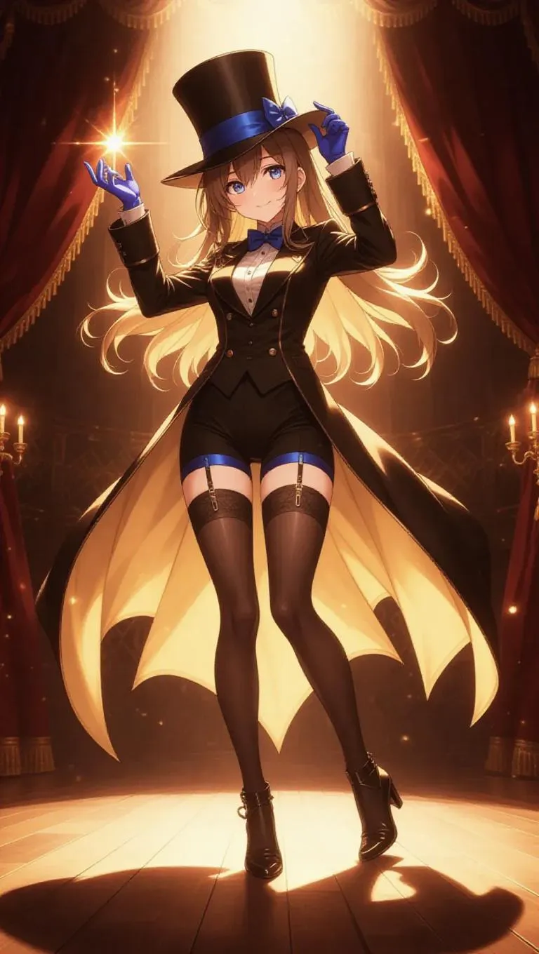 An anime girl magician in a classic tailcoat, sheer stockings, and blue gloves dramatically pulls a glowing spell from her top hat. She stands in a spotlight on a darkened theater stage, her pose emphasizing the magical moment. Soft, warm stage lights highlight her figure, creating a sense of mystery and enchantment. The background fades into shadows, focusing all attention on her. The style is a blend of anime and theatrical realism, enhancing the dramatic effect.