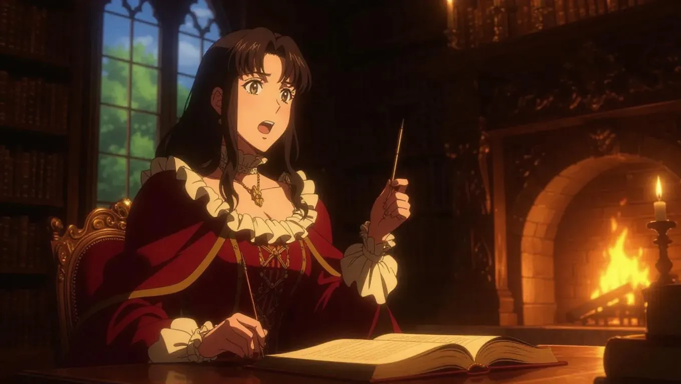 An anime historian in an ornate Renaissance robe lectures passionately before a crackling fireplace, gesturing with a quill pen. Her expression is animated and engaging, eyes sparkling with fervor. The grand library is lined with shelves of ancient books and scrolls, illuminated by gentle warm light that highlights her animated storytelling.