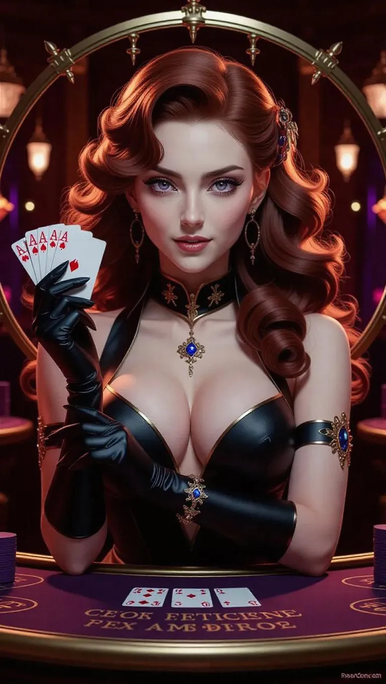 1 mysterious and seductive woman, solo, (incredible high resolution, masterpiece, highest quality, highly detailed, CG, high quality anime drawing), (female dealer holding fortune cards), (casino dealer outfit, sleek outfit, stylish gloves, high heels, unique accessories, brooch), (auburn, long curly hair, violet eyes, jitome: 1.2, enchanting gaze, plush lips, statuesque figure, breathtaking beauty, carefully crafted face), (cryptic smile, teasing and sly expression, enticing pose like a mystical sorceress), (super beautiful detailed background, sexy cutout, background: fantasy casino, crystal table, exotic fruits, magical atmosphere, teal light up, perspective from below)