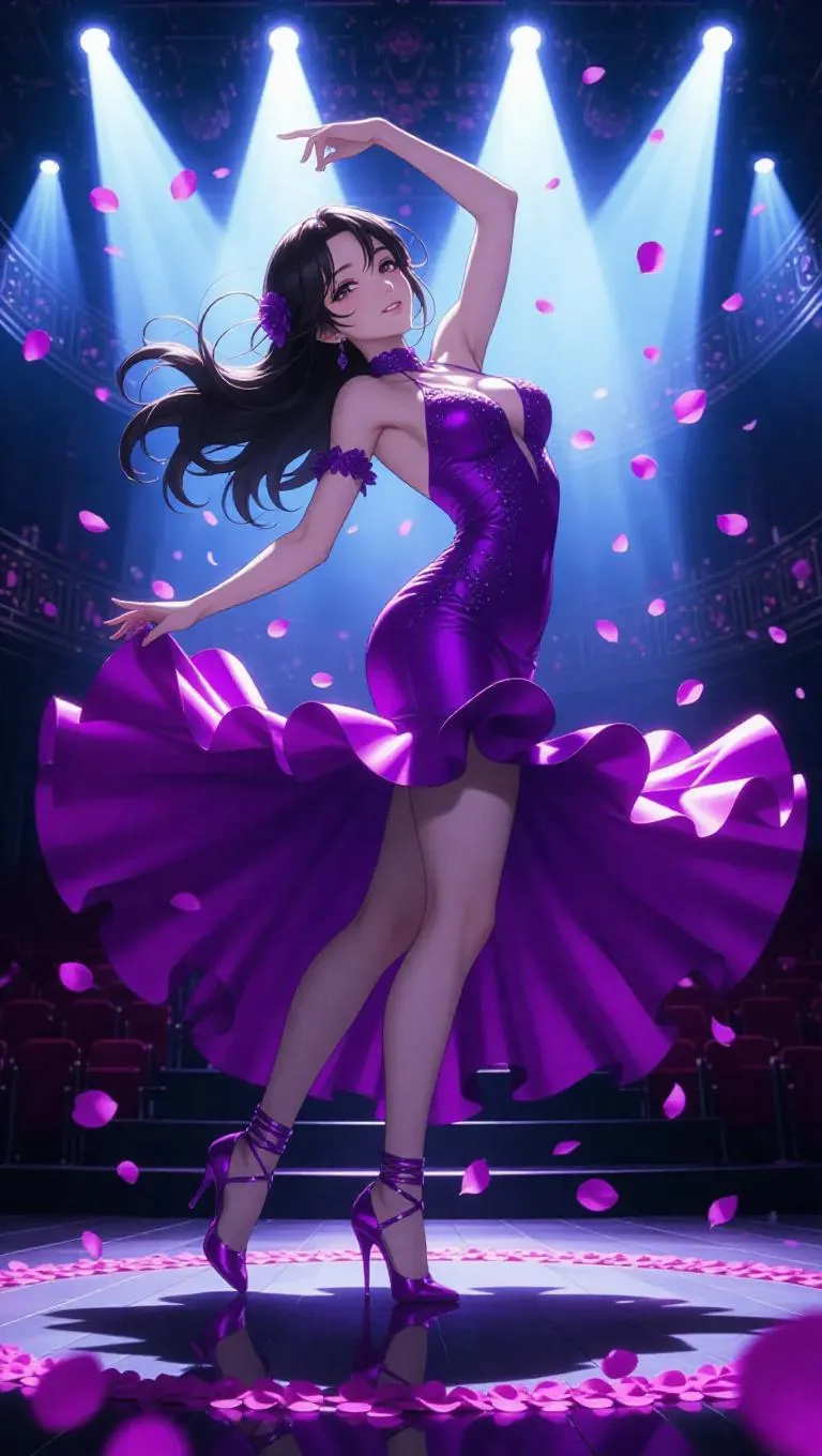 A sultry anime dancer in a purple flamenco dress with a plunging back is frozen mid-spin, her body elegantly arched. Rose petals swirl around her, illuminated by cool white stage lights that cast soft highlights on her flowing dress and create dramatic shadows. The background is a grand theater stage, emphasizing her dynamic pose and the fluid motion of her dance.