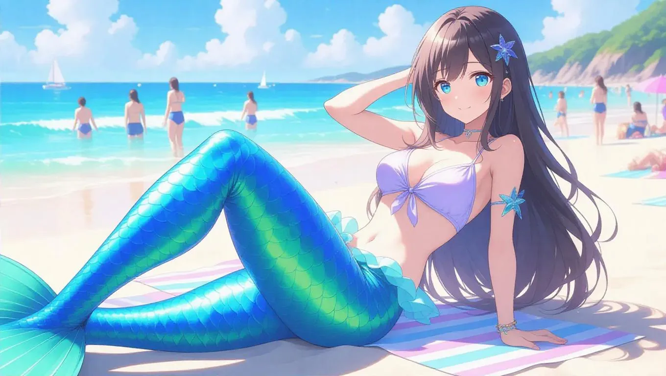 An anime mermaid princess lounges on a beach, her tail sparkling in the sunlight. She wears a casual crop top made of surf fabric. Her expression is relaxed, and her pose is inviting. The scene is during a summer day, with people enjoying the sun nearby. Bright, cheerful colors encompass the setting, radiating warmth and joy. The style is fun and playful, featuring vibrant patterns and lighthearted details.
