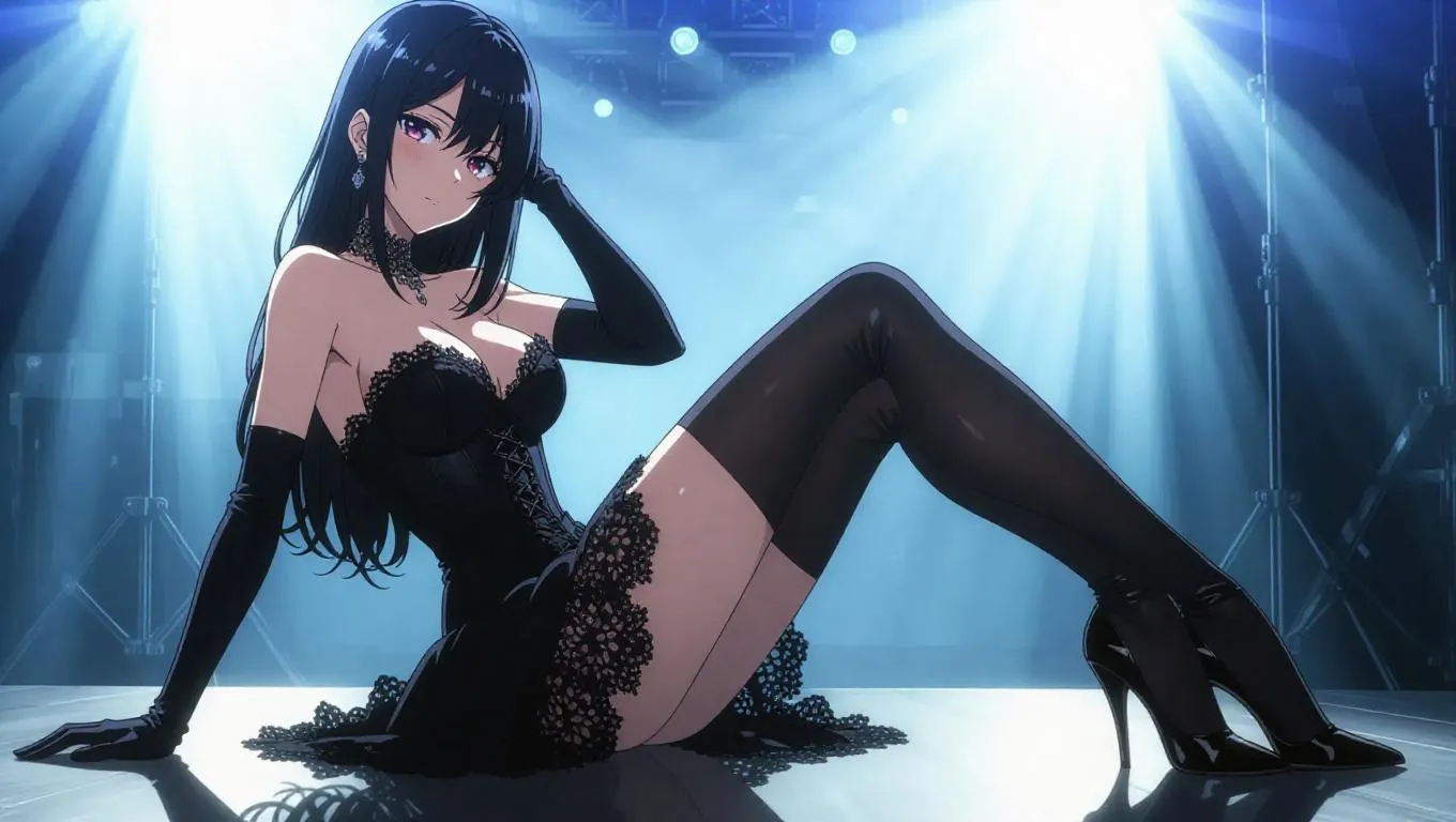 An anime model in a black lace corset dress and long opera gloves poses backstage at a glamorous fashion show. She crosses her legs elegantly, her high heels catching the glint of studio spotlights. The backstage area is dimly lit, with the harsh, focused light creating sharp contrasts and highlighting her poised, confident expression. The style is a blend of high fashion and anime aesthetics, emphasizing sleek lines and dramatic shadows.