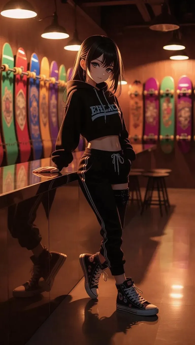 A stylish anime skateboarder leans against a polished counter, her trendy outfit and high-top sneakers accentuating her figure. Her eyes glint flirtatiously under the warm, ambient skate park lights, which cast a soft glow over her. Rows of colorful skateboards line the background, adding a vibrant touch to the scene. The lighting is warm and inviting, creating a cozy and intimate atmosphere. Style: Anime.