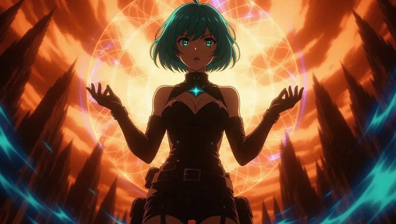 An anime sorceress with sleek, short teal hair stands in a summoning circle, her fitted bodice and combat boots accentuating her figure. She summons magic, with swirling shadows encircling her, casting an ominous light. The wind howls around her, adding a menacing energy to the scene. The environment is dark and foreboding, with jagged mountains looming in the background. The lighting is harsh and dramatic, highlighting her fierce expression and the intricate details of the magic circles. Style: Anime, with a touch of darkness and mystery.