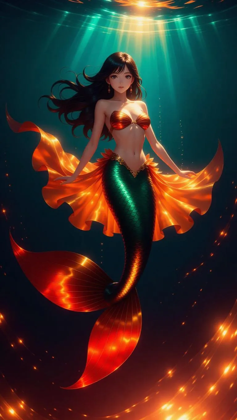 An anime mermaid princess skims through the surface of the ocean, her tail glistening. She wears a chic sarong that billows in the breeze. Her expression is adventurous, and her pose is dynamic. The scene is at sunset, with warm colors spreading across the sky. The waves reflect hues of orange and pink, enhancing the romantic atmosphere. The style is vibrant and warm, combining energy with softness.
