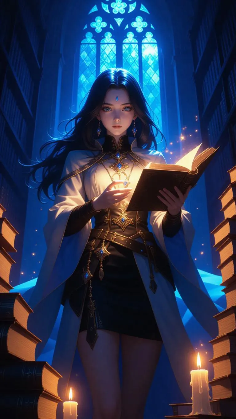 A noble anime mage in flowing robes and silver amulets, mid-casting a spell with a glowing orb in her hands. She stands in a dimly-lit library filled with ancient books, the air filled with the scent of aged parchment. Dim, mysterious light from floating candles casts shadows, highlighting the mage's focused expression and the intricate patterns of the bookshelves. The scene is infused with a sense of knowledge and mystery, capturing the essence of a scholarly sanctuary.