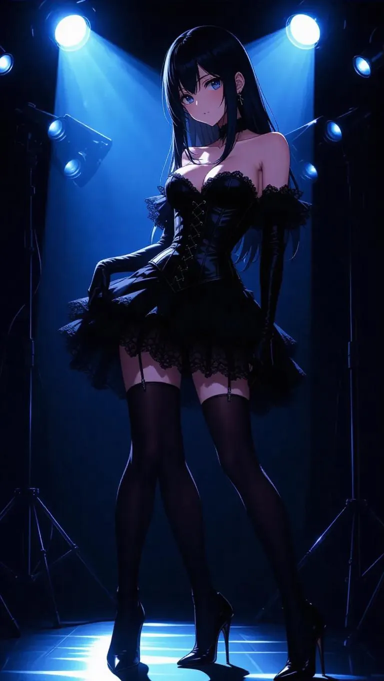 An anime model in a classic black lace corset dress and arm warmers poses backstage at a glamorous fashion show. She leans forward inquisitively, her elegant heels catching the glint of studio spotlights. The backstage area is dimly lit, with stark lighting emphasizing vibrant contrasts and enhancing her inquisitive expression. The style merges classic fashion and anime aesthetics, emphasizing graceful lines and intricate shadows.