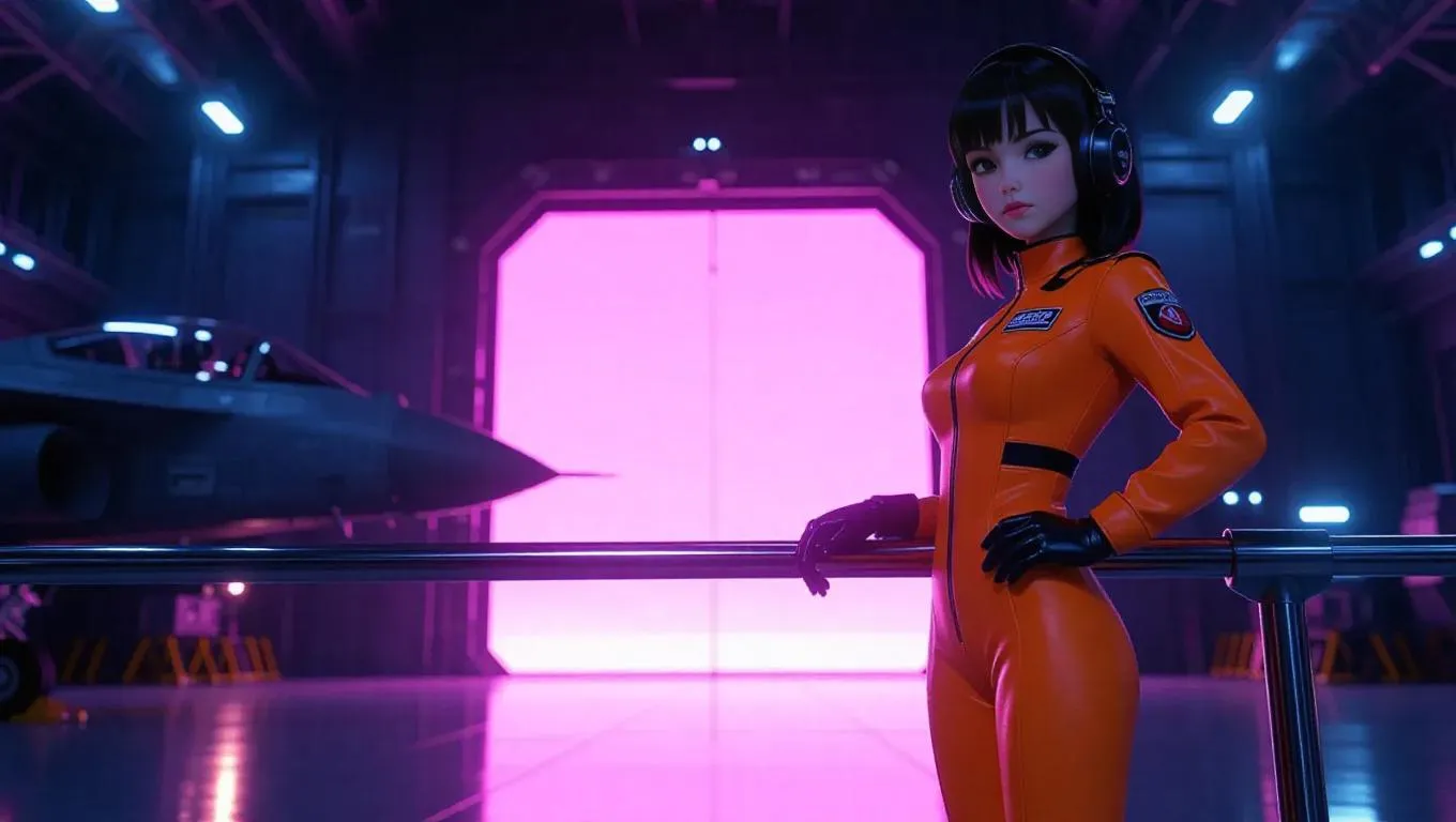 A futuristic anime pilot stands assertively in a bright orange flight suit, her headset snugly fit over her head. She leans casually against a polished railing, lips confidently sealed, in front of a dazzling aircraft hangar door. The backdrop is set in a sleek modern environment, with the hangar door radiating a gentle pink light that envelops her in a warm embrace. The lighting is smooth and flowing, detailing the sharp lines of her suit and the sleek setting. The artistic style merges realism and anime, with an emphasis on cool poses and technical detail.