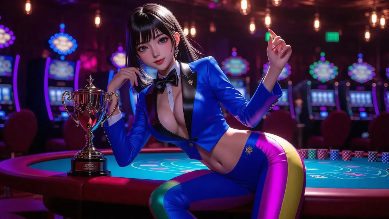A glamorous anime sportswoman in a royal blue tuxedo jacket, colorful leggings, and stylish trainers leans energetically on a sports-themed casino table. She holds a trophy in one hand, her expression proud and inviting. Sports memorabilia decorates the background, lit by bright, lively ambient lighting. The scene conveys victory and enthusiasm, with an added playful quality. Style: Anime, with a realistic touch.